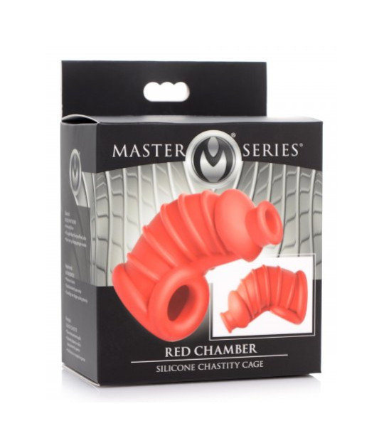 A softer, flexible option for particularly kink-minded playmates, the Master Series Red Chamber Silicone Chastity Cage helps keep a captive cock completely and comfortably under control. In temperature receptive silicone, the Cage traps your or their entire shaft in a super-smooth tamper proof tube with only the smallest tip opening. Stretching very securely over a penis, the Red Chamber features a thick, plushy silicone ring that loops under the balls while circling the shaft. That small opening allows for urination and, since it contains no metal or hard bits, is safer for travel and even airport security. In body safe silicone, the Red Chamber is easy to clean with warm soapy water and a good toy cleaner, but it can also be boiled or bleached for more thorough sterilization.