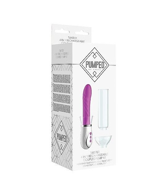 Pump up the volume with the Twister 4-in-1 couples kit by PUMPED! This set is guaranteed to satisfy the couple who is always looking for new ways to enhance their intimate time. With penis, breast and clitoral pump attachments, the Twister set allows you to mix and match functions before diving in to the main event! Enhance your erogenous zones with tantalising air pumping which increases size, sensitivity and blood flow to any area it's applied. Once you've become swollen with bliss, turn on the full-size rotating vibrator and let yourself be transported to nirvana! With four different suction strengths and 7 unique vibrating modes, the possibilities for pleasure are endless with this couples kit!