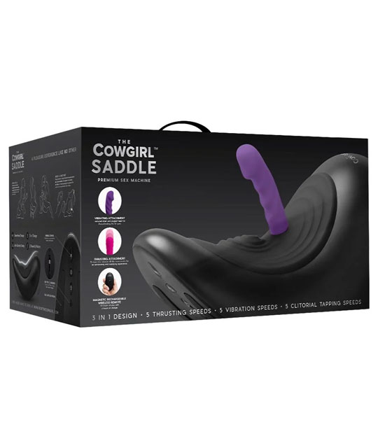 The Cowgirl Saddle Machine is the ultimate stay at home thrill ride your body has been craving. Designed for hands free pleasure, its self rocking motion transforms “saddle up” from playful slang into a whole new bedroom command. Built for fully customisable enjoyment, it features two interchangeable attachments, five thrusting speeds, five vibration patterns, and five clitoral tapping settings, delivering more variety than your go to takeaway order. The anti gravity swing creates fluid, lifelike motion that feels both natural and exhilarating. Thoughtfully engineered for comfort and stability, the saddle measures 44.1 cm in length and 24.5 cm in width, with a manageable weight of 1.3 kg that makes positioning and storage easy. A magnetic switching system allows for quick, effortless attachment changes, while the included wireless remote keeps control firmly in your hands. Complete with charging cables and a silicone rider plug, the Cowgirl Saddle Machine is a bold fusion of smart design and indulgent performance, crafted with one mission in mind: your satisfaction.
